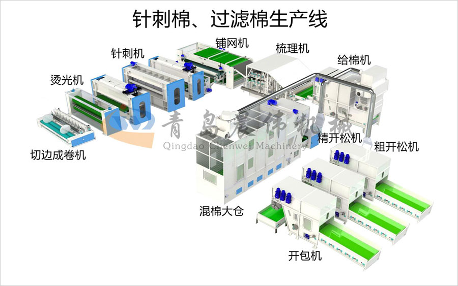 開包機(jī)-開松機(jī)-振動(dòng)給棉機(jī)-梳理機(jī)-鋪網(wǎng)機(jī)-針刺機(jī)-切邊成卷機(jī)