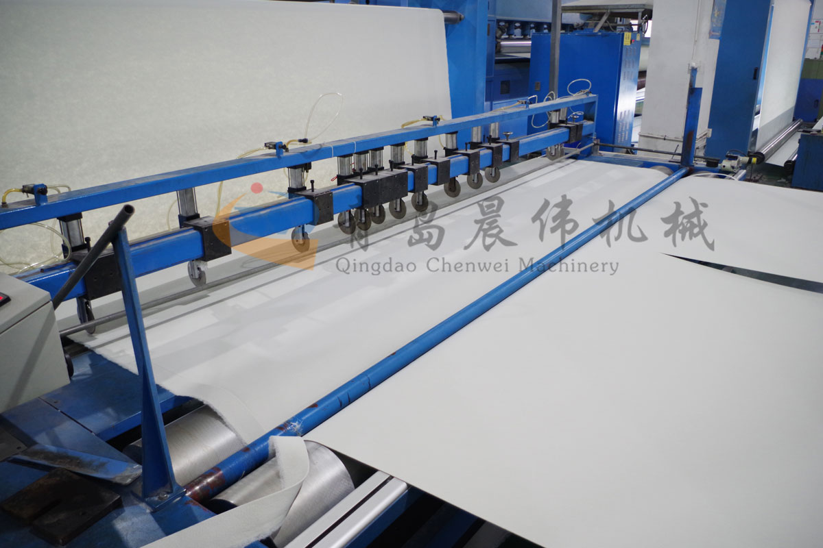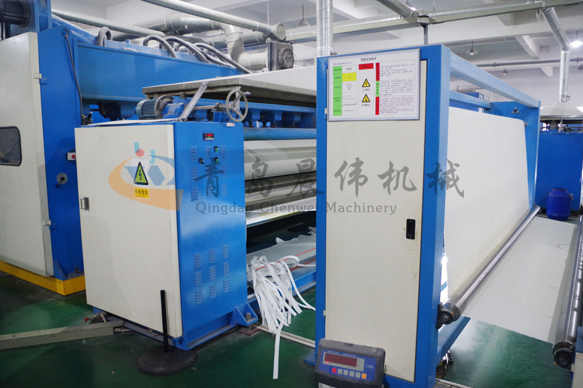 5. CWPW-鋪網(wǎng)機(jī):用于將梳理纖網(wǎng)通過(guò)移動(dòng)小車交叉折疊為所需幅寬和定量的多層纖網(wǎng),以供后道工序使用。鋪網(wǎng)輥采用特殊結(jié)構(gòu),加裝壓網(wǎng)輥和導(dǎo)流板,不飄網(wǎng)不起皺,五只大功率電機(jī)精確控制各部件的運(yùn)動(dòng),電動(dòng)輸出簾高度調(diào)節(jié)裝置