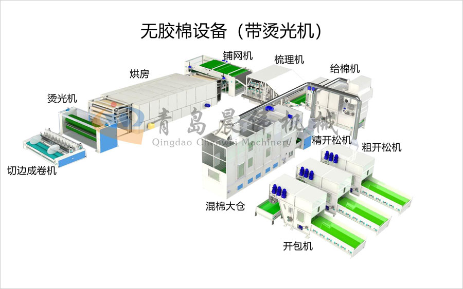 開包機(jī)-開松機(jī)-振動(dòng)給棉機(jī)-梳理機(jī)-鋪網(wǎng)機(jī)-烘房-切邊成卷機(jī)