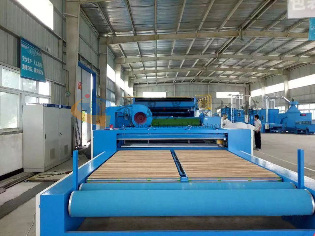 5. CWPW-鋪網機:用于將梳理纖網通過移動小車交叉折疊為所需幅寬和定量的多層纖網,以供后道工序使用。鋪網輥采用特殊結構,加裝壓網輥和導流板,不飄網不起皺,五只大功率電機精確控制各部件的運動,電動輸出簾高度調節(jié)裝置
