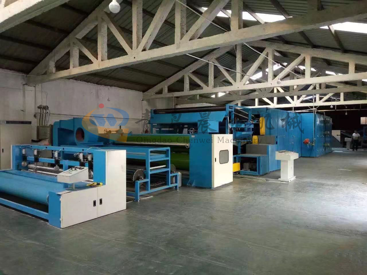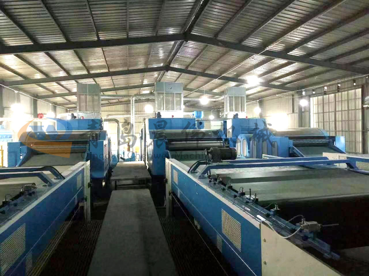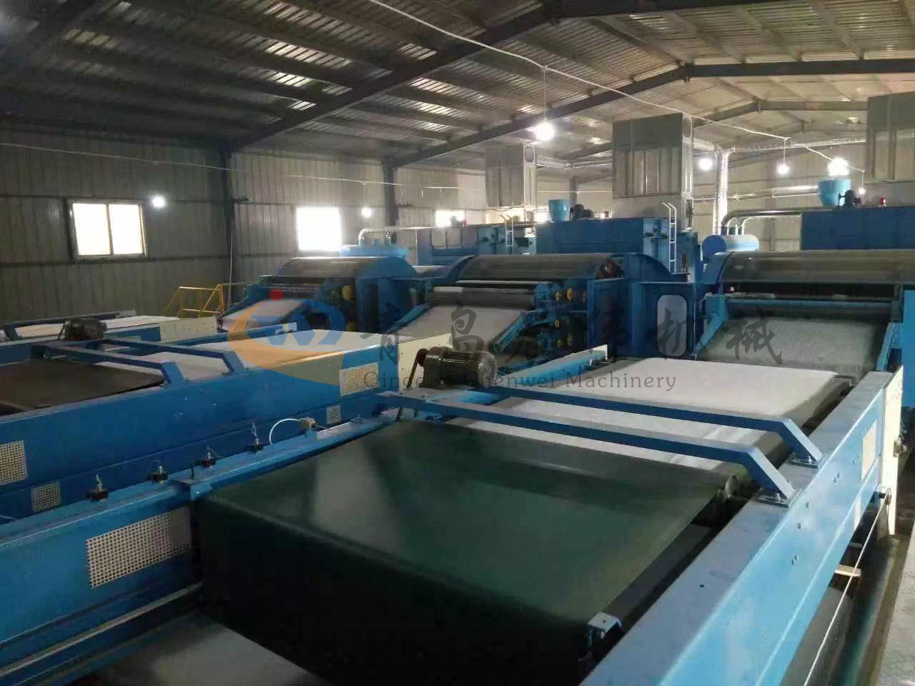 開包機(jī)-開松機(jī)-振動(dòng)給棉機(jī)-梳理機(jī)-鋪網(wǎng)機(jī)-烘房-燙光機(jī)-成卷切片機(jī)